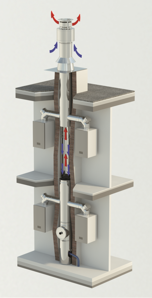 Vzduchovo-spalinový komínový systém Schiedel CLV  pre prívod spaľovacieho vzduchu a odvod spalín od viacerých plynových spotrebičov koncentrickým spôsobom.